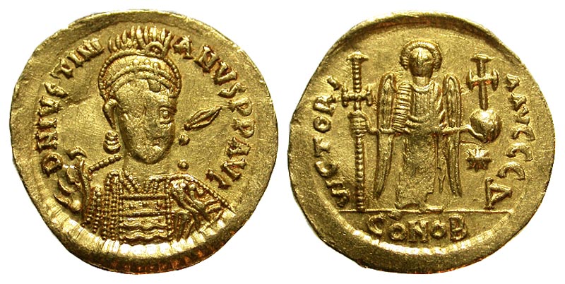 Justinian I. 527-565. AV solidus (20.5 mm, 4.48 g, 6 h). Constantinople, 527-538. DN IVSTINIANVS PP AVG, helmeted and cuirassed bust facing slightly right, holding spear over shoulder and shield decorated with horseman spearing a fallen enemy / VICTORIA AVGGG, Angel standing facing, holding long cross and globus cruciger; star in right field; Δ/CONOB. SBV 137; DOC 3d. gVF.