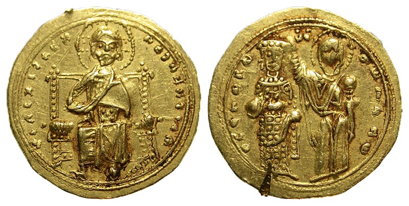 Romanus III Argyrus. 1028-1034. AV Histamenon Nomisma (23.8 mm, 4.35 g, 6 h). Constantinople. + IhS XIS RЄX RЄGNANTInm, Christ seated facing on throne, holding Gospels and raising hand in benediction / ӨCЄ ЬONӨ RШMAnШ, The Virgin Mary standing facing, crowning Romanus III, facing to left, holding globus cruciger; barred MӨ above. SBV 1819; DOC 1d. VF, small nick on reverse edge.