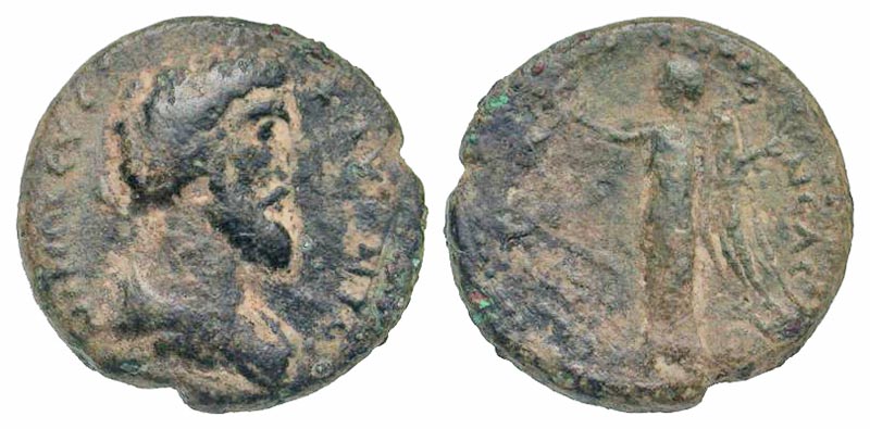 Samaria, Neapolis. Marcus Aurelius. A.D. 161-180. AE 21 (21.0 mm, 5.73 g, 11 h). AYT K AY ANTωNEINOC EYC, laureate, draped, and cuirassed bust right / ΦΛ NEAC ΠOΛEωC CYP ΠAΛ, Nike advancing left, holding wreath and palm. Rosenberger 13; SNG ANS 980; Sofaer 43. Fine. Scarce.