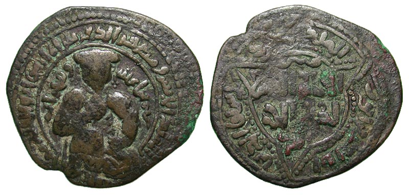 Ayyubids, Branch at Mayyafariqin & Sinjar. al-Ashraf Musa. 607-617/1210-1220. Æ dirhem (33.5 mm, 11.90 g). Mayyafariqin, 612 AH. Turbaned prince seated facing, with right leg drawn up, holding globe in right hand, placing left hand on hip / Legend citing al-Adil I Abu Bakr as overlord within and around trilobe. Balog 851; Album 859.1; Edhem 196. Fine.