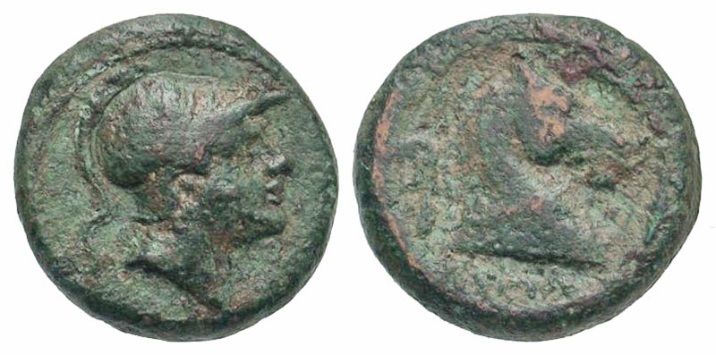 Anonymous [Sickle]. Ca. 241-235 B.C. AE litra (16.3 mm, 3.53 g, 11 h). Rome mint. Helmeted head of Mars right / ROMA, horsehead right; sickle behind. Crawford 25/3; Sydenham 26. Fine, blue-green patina. Ex RBW collection (not in previous sales), Baldwins (June 1981).