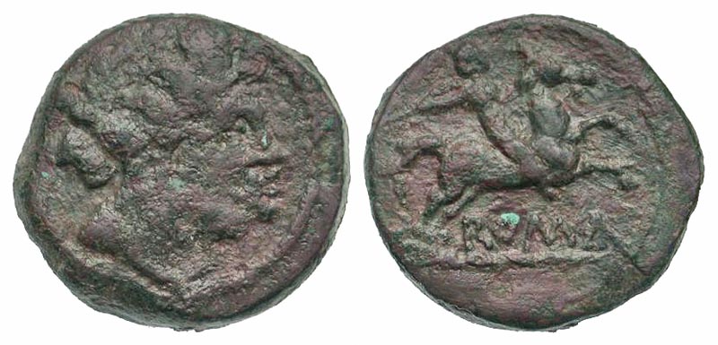 Anonymous. Ca. 217-215 B.C. AE semuncia (20.0 mm, 6.57 g, 11 h). Campania mint. Draped female bust right, wearing mural crown / ROMA, horseman right on galloping horse, holding whip. Crawford 39/5; Sydenham 97. aVF.