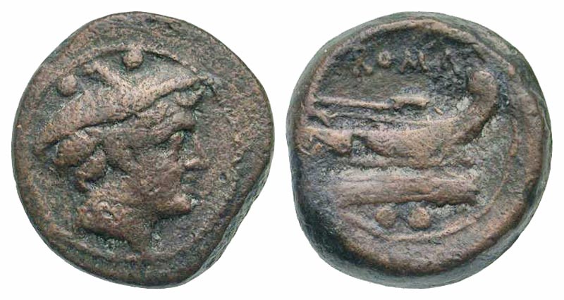 Anonymous. after 211 B.C. AE sextans (21.8 mm, 8.36 g, 11 h). Rome mint. Head of Mercury right, wearing petasos, two pellets above / ROMA, prow of galley right, two pellets below. Crawford 56/6; Sydenham 231d. aVF.