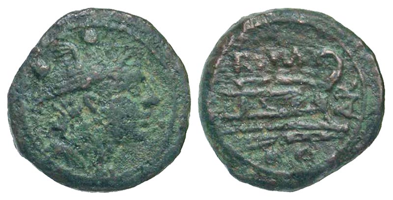 Anonymous. Ca. 210 B.C. AE sextans (19.3 mm, 4.27 g, 9 h). Sardinia mint. Head of Mercury right wearing winged petasos; two pellets above / ROMA, prow of galley right; AVR monogram to right, two pellets below. Crawford 65/6; Sydenham 162f. aVF, thick, green patina.