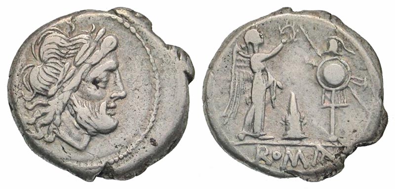 Lot 53-146. Anonymous. 206-195 B.C. AR victoriatus. Rome mint. Ex RBW collection (not in previous sales), Ex Victor England (April 8, 1988).