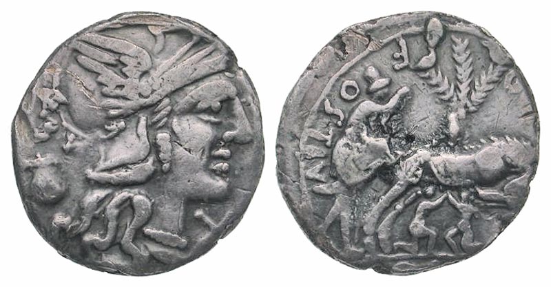 Sex. Pompeius. 137 B.C. AR denarius (18.8 mm, 3.74 g, 5 h). Rome mint. Helmeted head of Roma right; jug to left, X below chin / SEX POMP FOSTLVS / ROMA, She-wolf standing right, head left, suckling the twins Remus and Romulus; to left, shepherd Faustulus standing right; in background, birds on fig tree. Crawford 235/1a; Sydenham 461; RSC Pompeia 1. Toned VF, struck on a small flan.