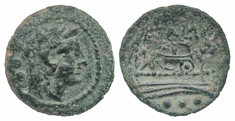 Anonymous. Ca. 91 B.C. AE quadrans (19.0 mm, 2.75 g, 2 h). Rome mint. Head of young Hercules right, wearing lion's skin headdress, three pellets behind / ROMA, prow of galley right, three pellets below. Crawford 339/4a; Sydenham 679c. aVF, .