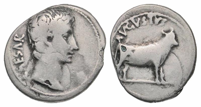Augustus. 27 B.C.-A.D. 14 AR denarius (20.1 mm, 3.23 g, 5 h). Samos(?) mint, struck ca. 21-20 B.C. CAESAR, bare head right / AVGVSTVS, young bull standing right, head erect. RIC 475; BMCRE 663; RSC 28. Fine. Scarce.