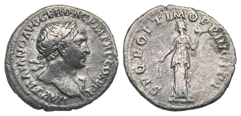 Lot 53-179. Trajan. A.D. 98-117. AR denarius. Rome mint, struck A.D. 107. Scarce.