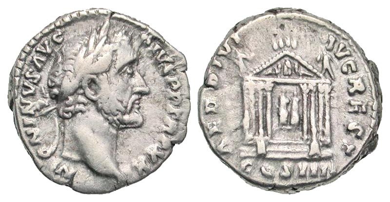 Antoninus Pius. A.D. 138-161. AR denarius (17.2 mm, 3.51 g, 5 h). Rome mint, struck A.D. 158-159. ANTONINVS AVG PIVS PP, laureate head right / TEMPL DIVI AVG REST, COS IIII, seated figures of Divus Augustus and Livia, set on podium, within octastyle temple. RIC 143; BMCRE 549; RSC 799b. aVF.