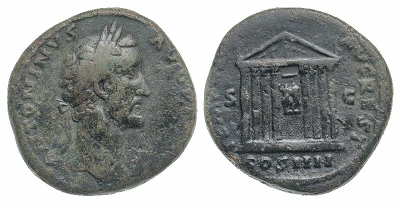 Antoninus Pius. A.D. 138-161. AE sestertius (31.3 mm, 26.85 g, 6 h). Rome mint, struck A.D. 145-161. ANTONINVS AVG PIVS P P, laureate head right / TEMPLVM DIV AVG REST, COS IIII, S-C, octastyle temple with statues of Divus Augustus and Julia Augusta seated facing within, group of three figures in the pediment, star and figure holding cornucopiae at the corners. RIC 787; BMCRE 1718 var (quadriga in pediment). Fine. Rare.