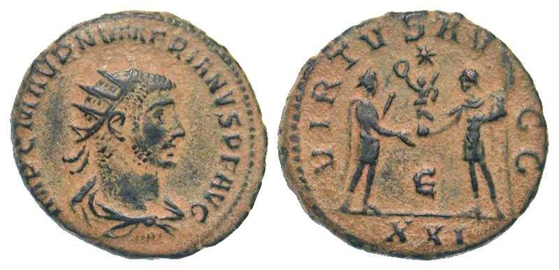Numerian. A.D. 283-284. AE antoninianus (20.4 mm, 3.81 g, 11 h). Antioch mint, struck A.D. 284. IMP C M AVR NVMERIANVS P F AVG, radiate, draped and cuirassed bust right / VIRTVS AVGG, Carus standing right, holding scepter and presenting globe to Numerian standing left, holding scepter, star above; Є/XXI in exergue. RIC 466; Pink 52. VF, sandy red patina.