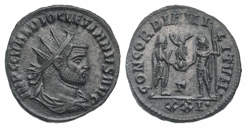Diocletian. A.D. 284-305. AE antoninianus (21.2 mm, 3.47 g, 6 h). Cyzicus mint, struck A.D. 295-296. IMP C C VAL DIOCLETIANVS AVG, radiate, draped and cuirassed bust right / CONCORDIA MILITVM, emperor standing right, holding parazonium, receiving Victory on globe from Jupiter standing left, holding scepter; Γ//XXI·. RIC 306. VF.