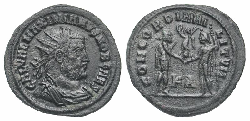 Galerius. A.D. 305-311. AE radiate fraction (22.4 mm, 2.77 g, 5 h). Cyzicus mint, struck A.D. 295-299. GAL VAL MAXIMIANVS NOB CAES, radiate, draped, and cuirassed bust right / CONCORDIA MILITVM, emperor standing right, holding parazonium, receiving Victory on globe from Jupiter standing left, holding scepter; KA between them. RIC 19b. VF.
