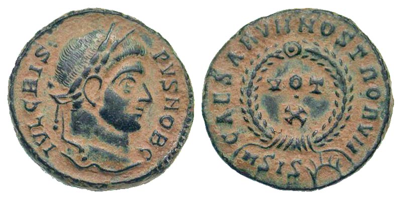 Crispus. Caesar, A.D. 317-326. AE 3 (18.4 mm, 3.27 g, 11 h). Siscia mint, struck A.D. 321-324. IVL CRISPVS NOB C, laureate head right / CAESARVM NOSTRORVM around VOT X in two lines within wreath; ASIS sunburst in exergue. RIC 181. gVF, sandy patina.