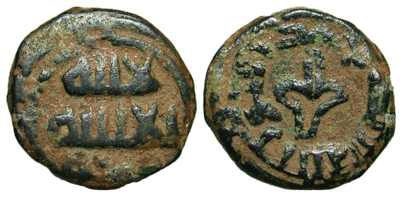 Umayyad Caliphate. Anonymous. 8th century Æ post-reform fals (18.2 mm, 4.80 g, 9 h). Al Urdunn. Kalima: la ilah illa Allah wahdahu within double circle with pellet / “Fleur de Lys”, Muhammad Rasul Allah. Al Urdunn in marginal legend, pellet within outer circle. Album 160/190 var; Goussouss 87 var. VF, Rare.