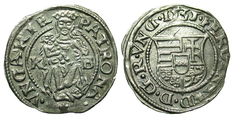 Hungary. Ferdinand I. 1526-1564. AR denar (15.6 mm, 0.55 g, 9 h). 1531. * FERDINAND • D • G • R • VNG *, coat of arms / PATRONA * * VNGARIE, Madonna seated facing, holding infant with both arms; K to left, B to right. Huszár 935. EF.
