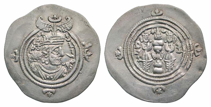 Sasanian Kingdom. Hormizd V. A.D. 631-632. AR drachm (32.8 mm, 3.96 g, 9 h). AW (Ahwaz) mint, dated RY 2. Crowned and cuirassed bust right, two stars above crest, three stars within crescents around / Fire altar with attendants and ribbon, star and crescent flanking flames, four crescents and stars around triple border of dots. Göbl 230. choice EF. Sharp strike.