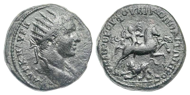 Moesia Inferior, Nicopolis ad Istrum. Elagabalus. A.D. 218-222. AE tetrassarion (26.1 mm, 11.36 g, 12 h). struck A.D. 218-222. Novius Rufus, consular legate. AVT K M AVPH ANTΩNEINOC, radiate head right / VΠ NOBIOV POV ΦOV NIKOΠOΛITΩN ΠPOC ICTPON, emperor hunting on horseback right, raising spear, attacking lion below. Varbanov 4020; Hristova & Jeckov 8.26.34.3; AMNG 1987. Fine, off center obverse. Rare.