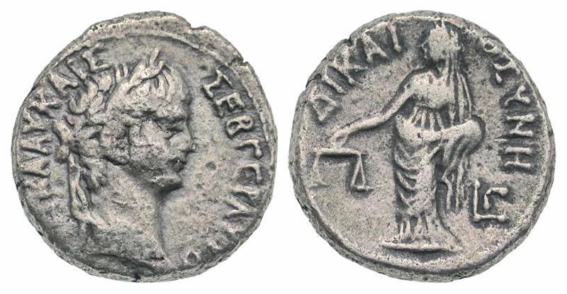 Egypt, Alexandria. Nero. A.D. 54-68. BI tetradrachm (25.0 mm, 12.91 g, 11 h). Dated RY 3=A.D. 56/7. ΝΕΡΩΝ ΚΛΑΥ ΚΑΙΣ ΣΕΒΑ ΓΕΡ ΑΥΤΟ, laureate head right / ΔIKAIOΣYNH, L Γ, Dikaiosyne, veiled, standing left, holding scales. RPC 5236; Milne 171; Dattari 225; Emmett 117. aVF.