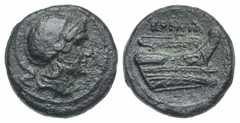 Anonymous. ca. 217-215 B.C. AE quartuncia (15.9 mm, 2.61 g, 5 h). Semi-libral standard. Rome mint. Helmeted head of Roma right, wearing Attic helmet / ROMA, prow of galley right. Crawford 38/8; Sydenham 88. aVF.