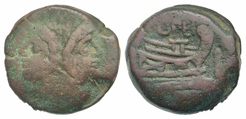 Q. Opimius. Ca. 169-158 B.C. AE as (32.4 mm, 23.21 g, 11 h). Uncial standard. Rome mint. Laureate head of bearded Janus; I above / OPEI / ROMA, prow of galley right; I to right. Crawford 190/1; Sydenham 363. Fine.