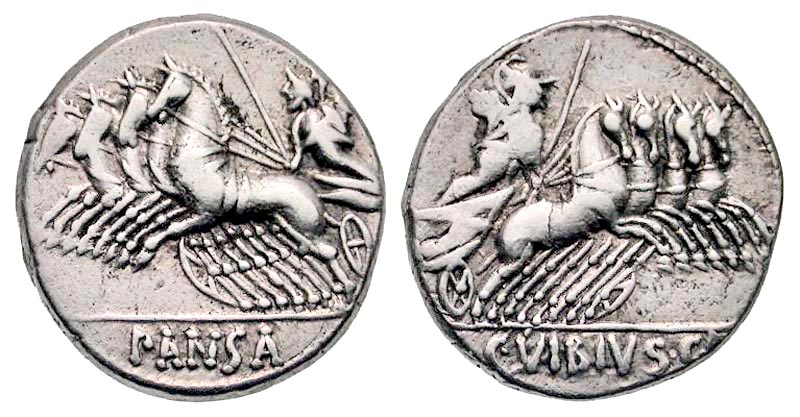 C. Vibius C.f. Pansa. 90 B.C. AR denarius (18.2 mm, 4.14 g, 5 h). Rome mint. PANSA, Minerva, holding spear, reins, and trophy, driving galloping quadriga left / C·VIBIVS·CF, Minerva, holding reins and spear, driving quadriga right. Crawford 342/6a; Sydenham 687; RSC Vibia 5. gVF.