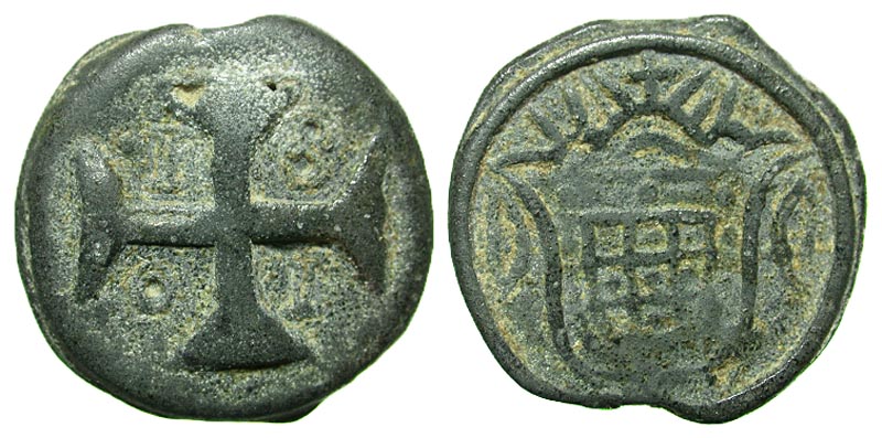 INDIA, Portuguese India. Diu. Joao. regent, 1799-1816. Tin 20 bazarucos (34.2 mm, 17.99 g, 6 h). 1801. cross, 1801 / crowned arms. KM 36. VF, sandy patina.