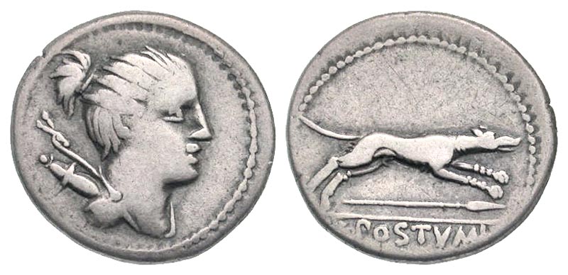 C. Postumius At? or Ta?. 73 B.C. AR denarius (19.3 mm, 3.96 g, 11 h). Rome mint. Bust of Diana right, bow and quiver on shoulder / C·POSTVMI, hound running right, spear below; AT monogram in exergue. Crawford 394/1a; Sydenham 785; RSC Postumia 9. Fine.