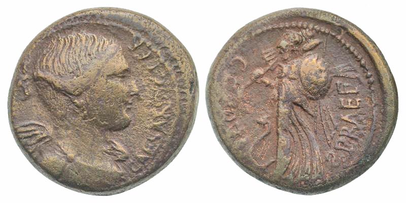 Julius Caesar. 45 B.C. AE dupondius (26.7 mm, 14.93 g, 1 h). Mediolanum(?) mint. C. Clovius, praefect. CAESAR·DIC·TER, draped bust of Victory right / C·CLOVI - PRAEF, Minerva standing left holding trophy over shoulder and shield decorated with Medusa, at her feet, snake left. Crawford 476/1a; Sydenham 1025; CRI 62; RPC 601. aVF, porous. Scarce.