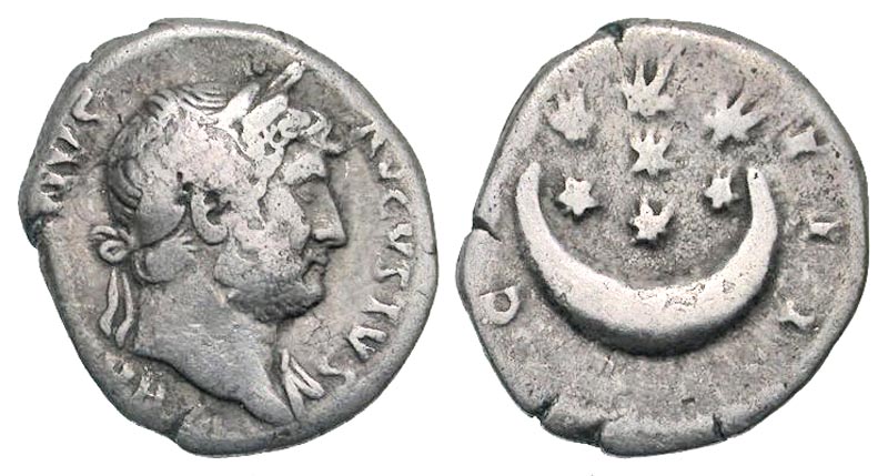 Hadrian. A.D. 117-138. AR denarius (18.7 mm, 2.99 g, 5 h). Rome mint, struck ca. A.D. 124-128. HADRIANVS AVGVSTVS, laureate bust right, slight drapery on far shoulder / COS III, sseven stars within crescent. RIC 202; BMC 463; RSC 466. Fine.