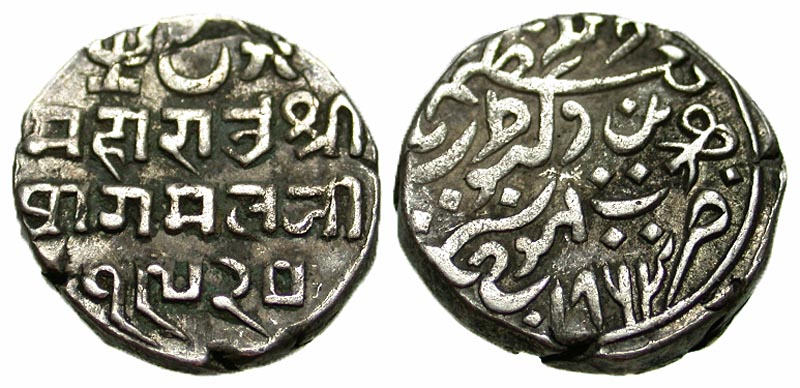 INDIA, Princely States. Kush. Pragmalji II in the name of Queen Victoria. 1860-1875. AR kori (16.1 mm, 4.61 g, 9 h). Bhuj, 1863. Persian inscriptions, naming Queen Victoria "MALIKA MU'AZZAMAH QUEEN VICTORIA", AD date in Persian numerals "1863" / MAHARAO SRI PRAGMALJI in two lines in Nagari, date 1920 VS. KM 14.2. VF.