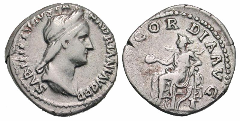 Sabina. Augusta, A.D. 128-136/7. AR denarius (18.4 mm, 3.44 g, 6 h). Rome mint, struck A.D. 128-134. SABINA AVGVSTA HADRIANI AVG P P, diademed and draped bust left / CONCORDIA AVG, Concordia seated left, holding patera and resting elbow on a small statue of Spes; cornucopia below chair. RIC 398 (Hadrian); RSC 12; BMCRE 895 (Hadrian). aVF.