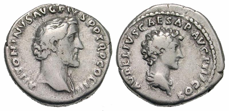 Antoninus Pius. A.D. 138-161. AR denarius (17.7 mm, 3.03 g, 6 h). Rome mint, struck A.D. 140. ANTONINVS AVG PIVS PP TR P COS III, bare head of Antoninus Pius right / AVRELIVS CAESAR AVG P II F COS, bare headed, draped bust of Marcus Aurelius right. RIC 415c; BMCRE 148; RSC 21a. aVF.