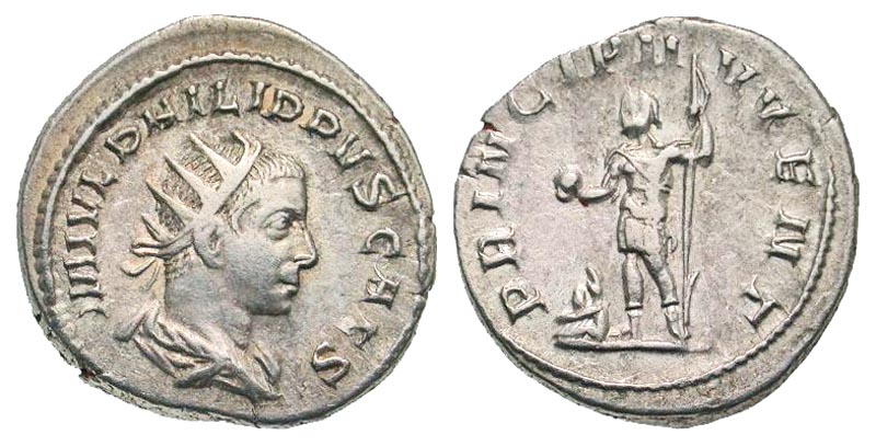 Philip II. As Caesar, A.D. 244-247. AR antoninianus (21.7 mm, 4.41 g, 7 h). Rome mint, struck A.D. 247. M IVL PHILIPPVS CAES, radiate, draped, and cuirassed bust right / PRINCIPI IVVENT, Philip standing left, holding globe and reversed spear; captive left at feet. RIC 219; RSC 57. aVF.