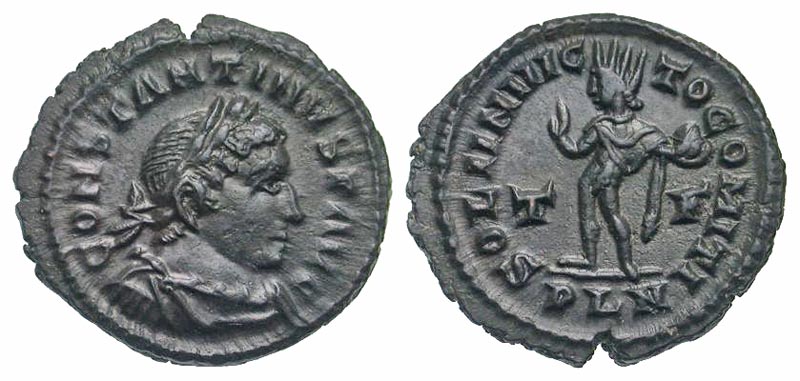 Constantine I. A.D. 307/10-337. AE follis (21.9 mm, 3.23 g, 6 h). London mint, struck A.D. 316-317. CONSTANTINVS AVG, laureate and cuirassed bust right / SOLI INVICTO COMITI, Sol standing left, chlamys across left shoulder, holding globe, right hand raised; T-F in fields, PLN in exergue. RIC 88. near EF.