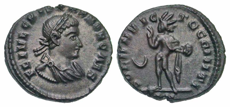 Crispus. Caesar, A.D. 317-326. AE follis (18.8 mm, 3.03 g, 6 h). London mint, struck A.D. 318. FL IVL CRISPVS NOB CAES, laureate and cuirassed bust right / SOLI INVICTO COMITI, Sol standing left, raising right hand and holding globe, crescent in left field, PLN in exergue. RIC 143. near EF, dark brown patina.