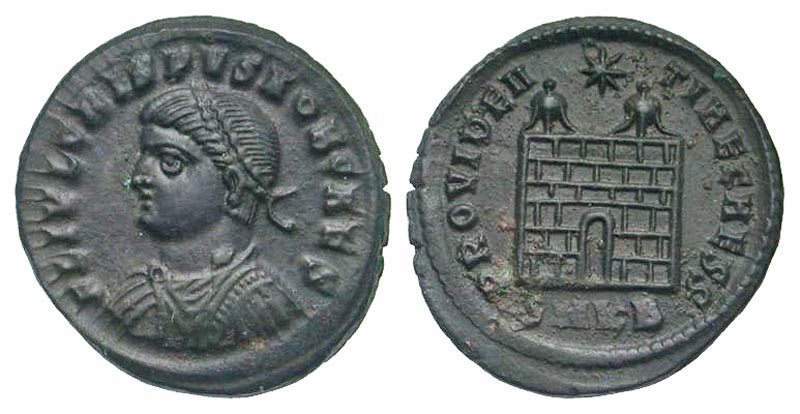 Crispus. Caesar, A.D. 317-326. AE 3 (19.9 mm, 2.77 g, 11 h). Cyzicus mint, struck A.D. 324-325. FL IVL CRISPVS NOB CAES, laureate, draped and cuirassed bust left / PROVIDENTIAE CAESS, camp gate with a star and two turrets above; SMKB in exergue. RIC 25; LRBC 1161. aVF.