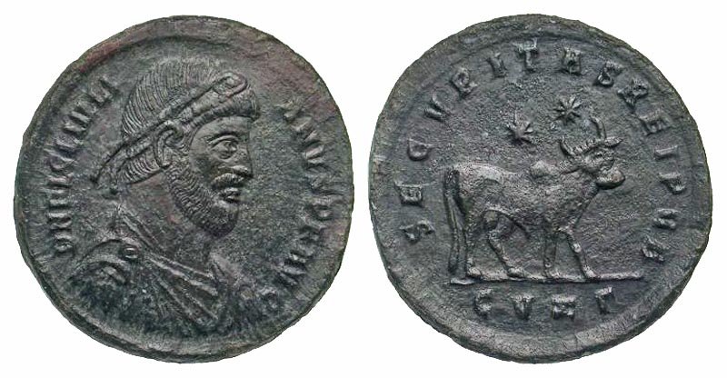 Julian II. A.D. 360-363. AE follis (29.4 mm, 8.57 g, 1 h). Cyzicus mint. D N FL CL IVLIANVS P F AVG, pearl-diademed, draped and cuirassed bust right / SECVRITAS REIPVB·, Apis bull standing right, two stars above: CYZΓ in exergue. RIC 127; LRBC 2511. aVF.