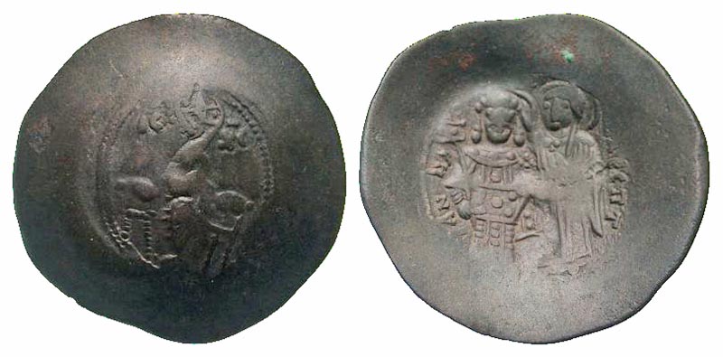 Manuel I Comnenus. 1143-1180. BI trachy (29.8 mm, 3.38 g, 6 h). Constantinople mint. IC-XC, Christ, bearded, seated on throne, wearing nimbus, pallium and colobion; raising right hand in benediction, holds book of Gospels in left hand / MANOVHΛ ΔECΠOT, The Virgin, nimbate, and Manuel, both standing facing; the Virgin wears pallium and maphorium and crowns the emperor who wears divitision and loros, holding labarum and globus cruciger. SBV 1966; DOC 13. aVF.