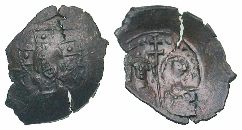 John Comnenus-Ducas. Emperor, 1237-1242. BI trachy (19.1 mm, 0.85 g, 7 h). Thessalonica mint. Facing bust of Christ Pantokrator / Facing busts of John and St. Demetrius; patriarchal cross between. SBV 2190 var (small module); DOC 4 var (same). VF, flan cracks.