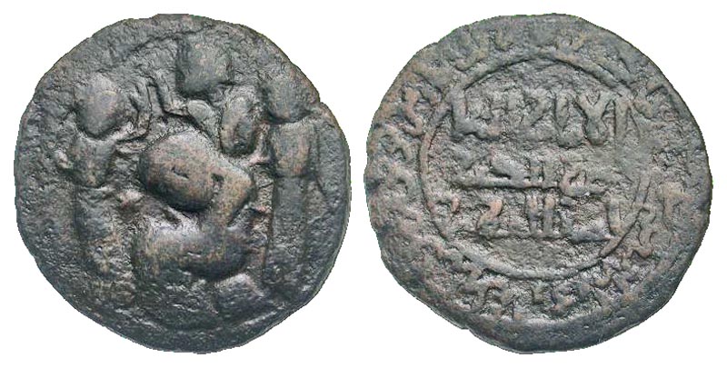 Artuqids of Mardin. Husam al-Din Yuluq Arslan. 580-597/1184-1200. AE dirham (31.9 mm, 12.75 g, 3 h). Dated A.H. 589. Lamentation scene depicting three standing figures around central female figure seated left, head lowered / Citing the Abbasid caliph, and Ayyubid overlord, Saif al-Din Abu Bakr. Whelan type III, 54-6; Spengler & Sayles 35.2; Album 1829.3. Fine.