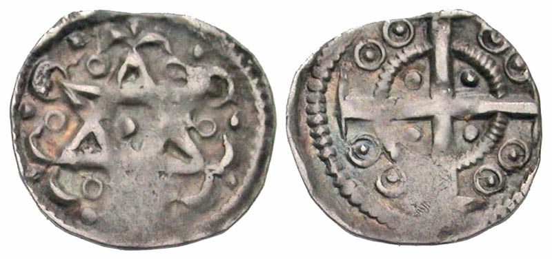 Low Countries, Flanders. Ypres. Anonymous. ca. 1140-1180. AR petit denier ou maille (11.3 mm, 0.33 g, 12 h). Struck ca. 1106-1108. Two triangles superimposed in field / I-P-R-A, cross with annulets in corners. Van H G2419. VF. Rare.