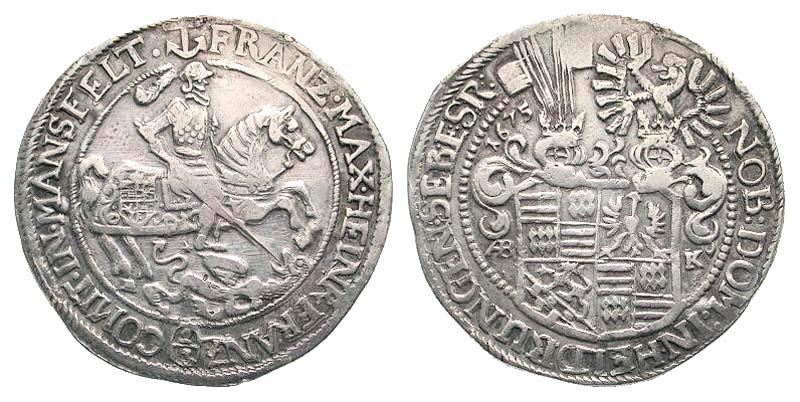 German States, Mansfeld-Artern. Franz Maximilian and Heinrich Franz. 1644-1692. AR 2/3 thaler (gulden) (40.3 mm, 18.84 g, 11 h). Eisleben mint, 1675. AB-K mintmaster's initials. St. George on horseback right, slaying dragon below / Elaborate coat of arms, two helmest and eagle above. KM 129. VF.