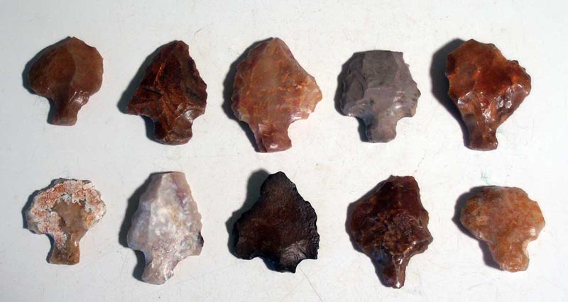 10 Aterian points from Egypt, ca. 45,000 - 30,000 BC. A group of 10 Aterian points from the northern Sahara region of Egypt, ca. 45,000 - 30,000 BC. This choice group of Middle Paleolithic period examples range from 1-1/4 to 2-1/8 in length and is made from beautifully colored chalcedony, quartz and flint; included are several translucent examples. Good calcification and mineral deposits. Ex Parker collection. Value range: $250 - $400.