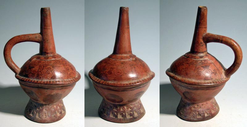Lambayeque Bottle from Peru, ca. 700 - 1300 AD. A choice Lambayeque (Sican) redware bottle from Peru, ca. 700 - 1300 AD. This lovely example is 7-3/4 high and is elaborately decorated with water symbols, as well as geometric and linear designs. The flared base is covered with the characteristic incised designs. Intact, good mineral deposits. Ex Gallatin estate. Value range: $500 - $700.
