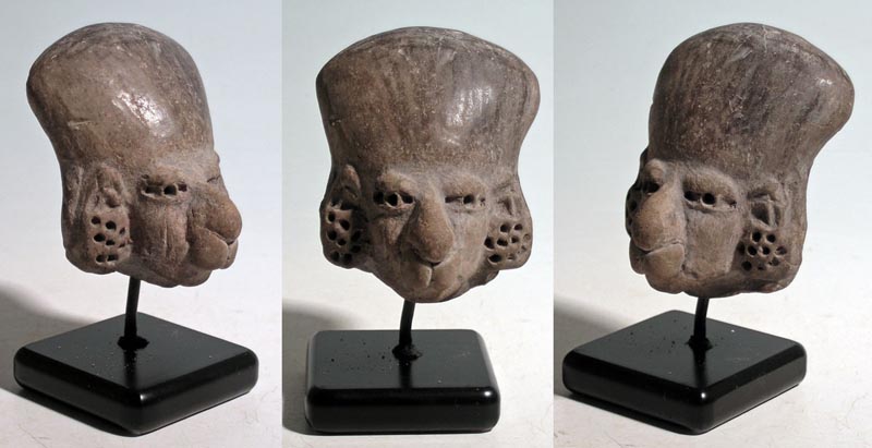 Manteno Head from Ecuador, ca. 1000 - 1500 AD. A large and superbly detailed Manteno head from Ecuador, ca. 1000 - 1500 AD. This nicely burnished example is 2-3/4 high and depicts an individual with the elongated head characteristic of the early types. He is adorned with complex ear ornaments and a large nose ring. Good mineral deposits, mounted on stand. Ex Florida estate. Value range: $125 - $250.