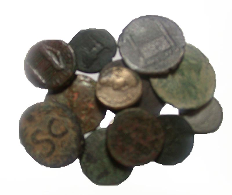 Lot of 12 Early Roman Provincial Coins. Lot of 12 early Roman bronze coins; including Augustus to Nero. Spain to Asia Minor. Low grade but some rarities included. Also included are a Marc Antony denarius and a Seleukid bronze of Antiochos IV.