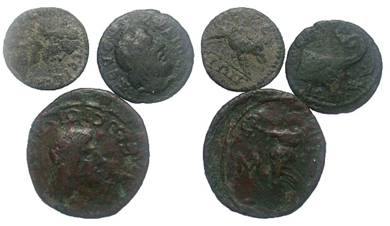 Lot of 3 Bronze Coins. Ionia, Ephesus. Caracalla. AD 198 - 217. AE-17. 2.19g. 6h. His laureate head rt. / Boar rt., transfixed by spear. BMC 260. aVF / Ionia, Smyrna. Time of Marcus Aurelius. c. AD 160 - 180. AE-18. 2.57g. 12h. Laureate head of Zeus Akraios rt. / CMVPNAIÙN, prow rt. SNG Von Aul 2187; Klose p. 161, 69. Fine. Includes old collection tag / Kings of Bosporos, Sauromates I. AD 93 - 124. AE-48 Unit. 9.63g. 23mm. 12h. His diademed and draped bust rt. / Nike advancing lt., holding wreath and palm, denomination mark M-H in fields. SNG Cop 39.Mottled red-brown patina. Includes neat old collection label.