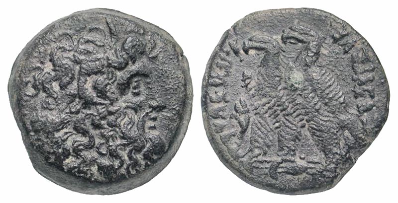 Ptolemaic Kingdom. Ptolemy VI & Ptolemy VIII. Coregency, 170-163 B.C. AE diobol (21.2 mm, 6.74 g, 11 h). Alexandria mint. Head of Zeus-Ammon right, wearing tainia / ΠTOΛEMAIOY BAΣIΛEΩΣ, two eagles standing left on thunderbolt; filleted cornucopia to left. Svoronos 1426; SNG Copenhagen 315. VF.
